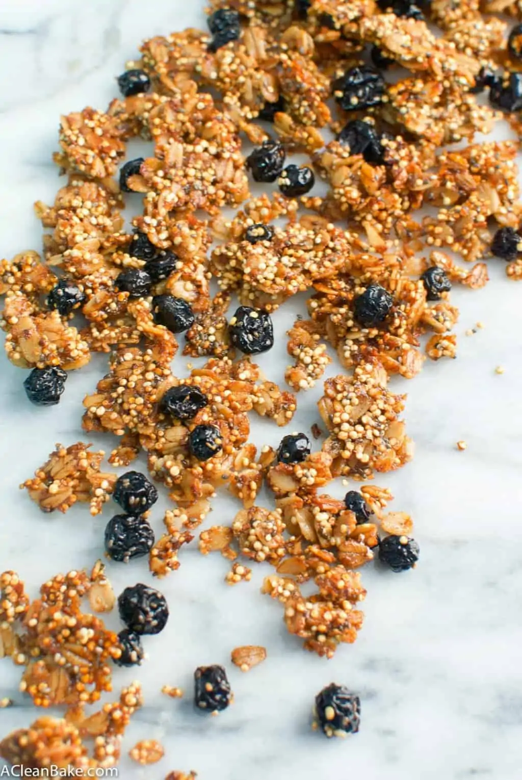 This blueberry chia quinoa granola is a crunchy sweet breakfast that is so easy to make! It’s tasty, healthy, & high protein. The whole family will love it!